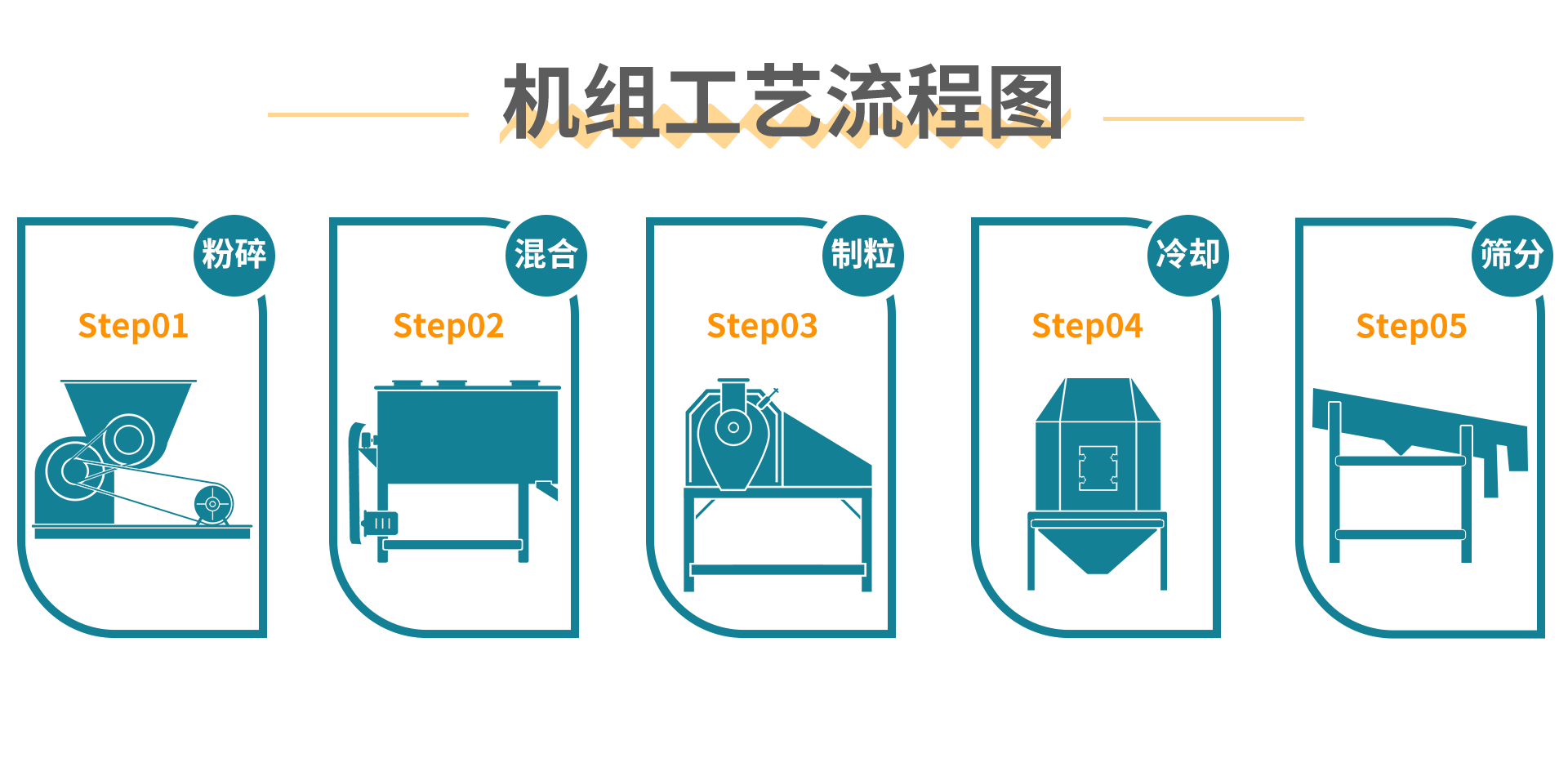 根據需求設計了這套顆粒(lì)飼料生產線,設備工作流程(chéng)包括:粉碎、混合、製(zhì)粒、冷卻、篩分。