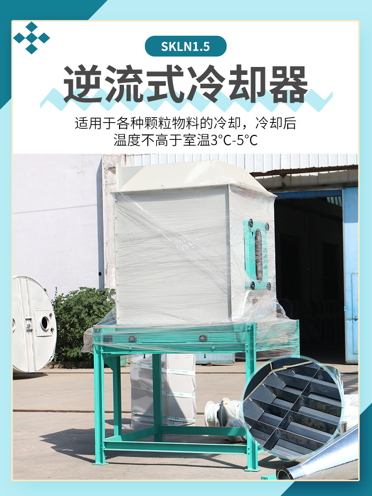 逆流冷卻器:SKLN1.5,功率1.1kw,作為生產製作飼料顆粒過程中(zhōng)必不可少的冷卻設(shè)備,可以有效防止成品(pǐn)顆粒(lì)飼料變形破碎(suì)的同時,還能防止貯藏時顆粒料產生粘結和(hé)黴變。