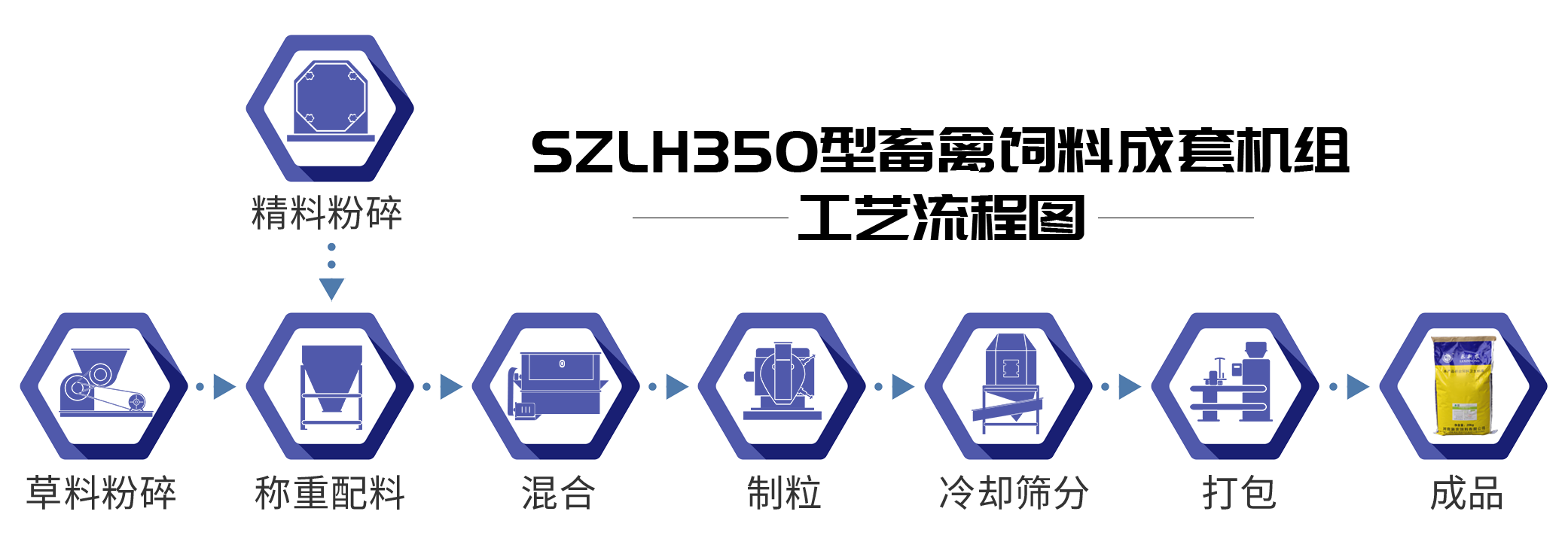 整條(tiáo)生產線包括6個工藝部分:原料粉(fěn)碎與稱重配料部分,混合部(bù)分,製粒部分,冷卻篩分和打包部(bù)分。輔助設備包括全自動控製係統,蒸汽供應係統和空氣壓縮係統。