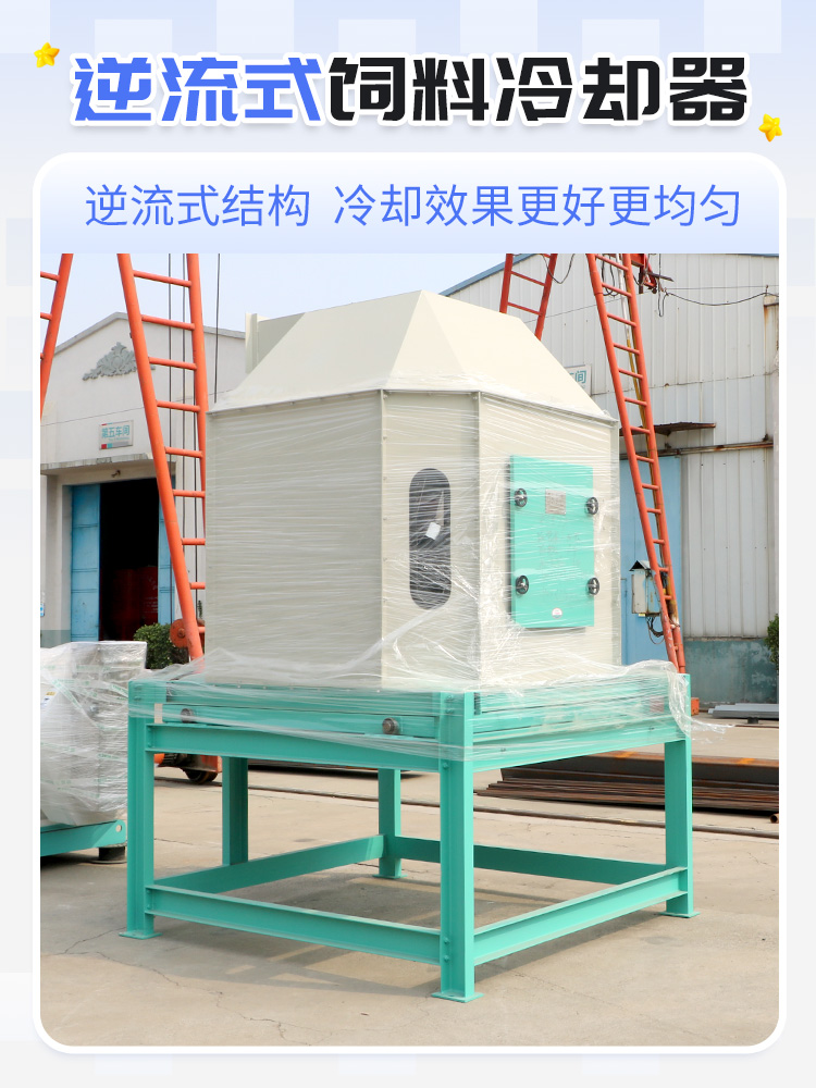 逆流冷卻器:SKLN2.5m³,功率1.1kw。主要用於飼料廠製粒工(gōng)段中顆粒飼料的冷卻,使得從製粒機中生產出來的溫度高達70-90℃,水分達到14%-16%的顆粒(lì)飼料(liào),冷卻後不高於室溫3-5℃,水分達到12.5%-14%。冷卻後的顆粒(lì)既(jì)增加了硬度,又能防止(zhǐ)黴變,便於(yú)顆粒飼料的運輸和貯存。