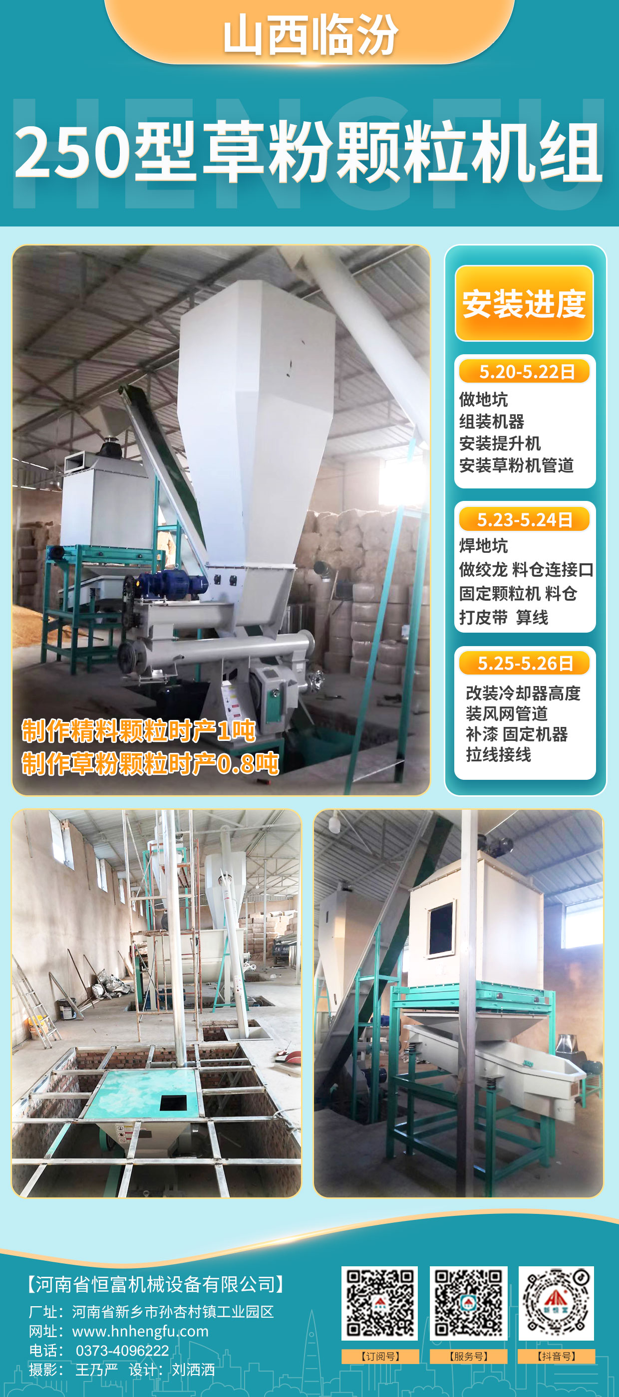 正在安裝的設備:非洲320型顆粒飼料機組、山西臨汾250型草粉顆粒飼料機組。