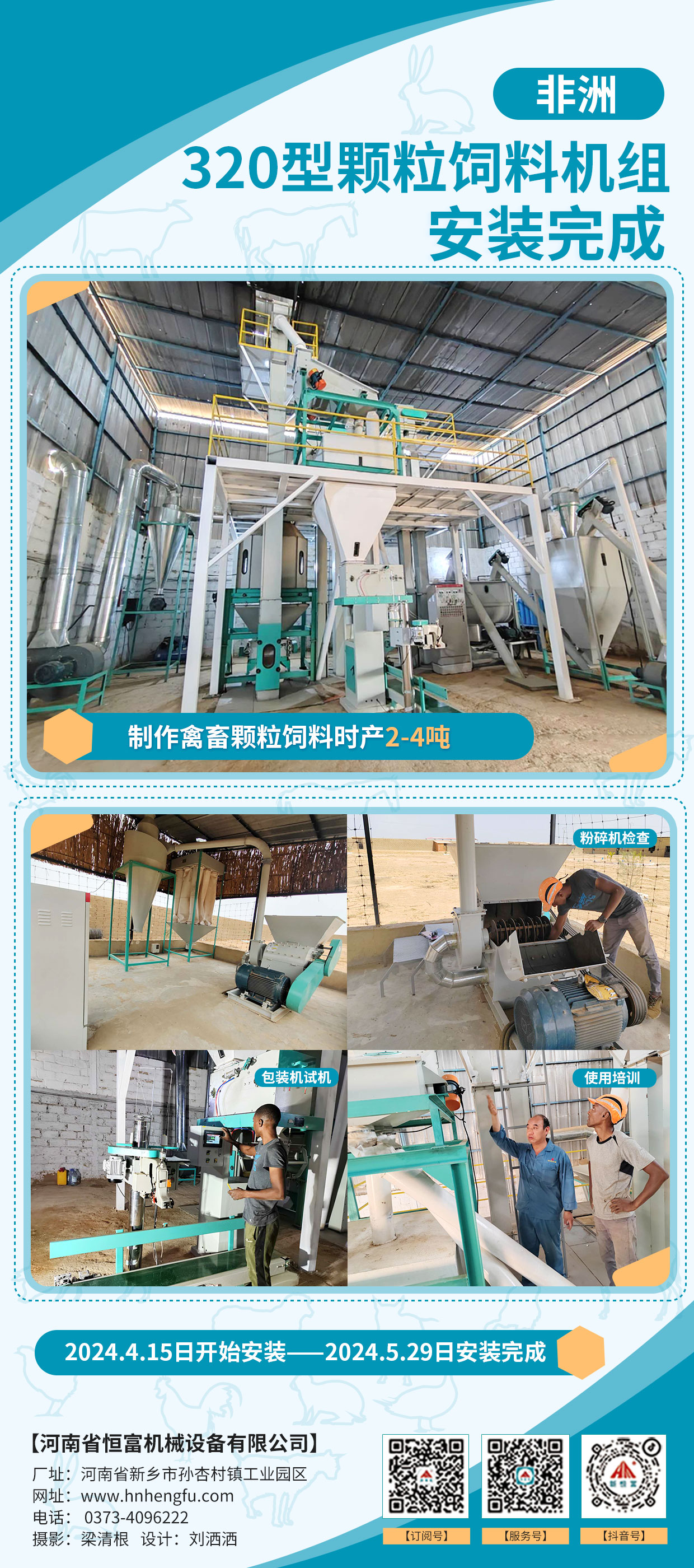 安(ān)裝完成(chéng)的設備:非洲320型顆粒飼料機組、內蒙古鄂爾多斯420型草粉顆粒飼料機組。