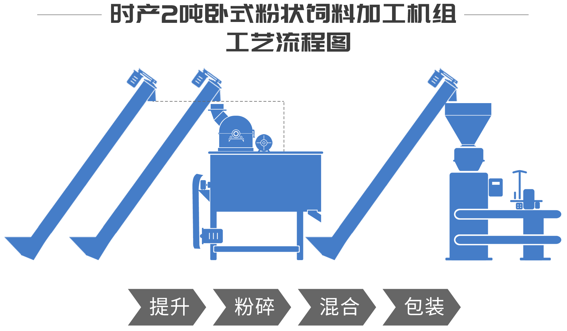 本套設備主要搭配有高效飼料粉碎機、單軸雙螺帶混合機、飼料定量包裝機、螺旋提升機以及電控櫃等。