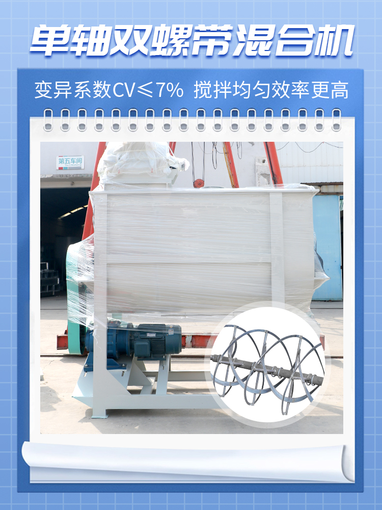 單軸(zhóu)雙螺帶混合機帶有液體添加管道,可添加水分、油脂以及糖蜜等。混(hún)合均勻度高,混合速度快(kuài)。