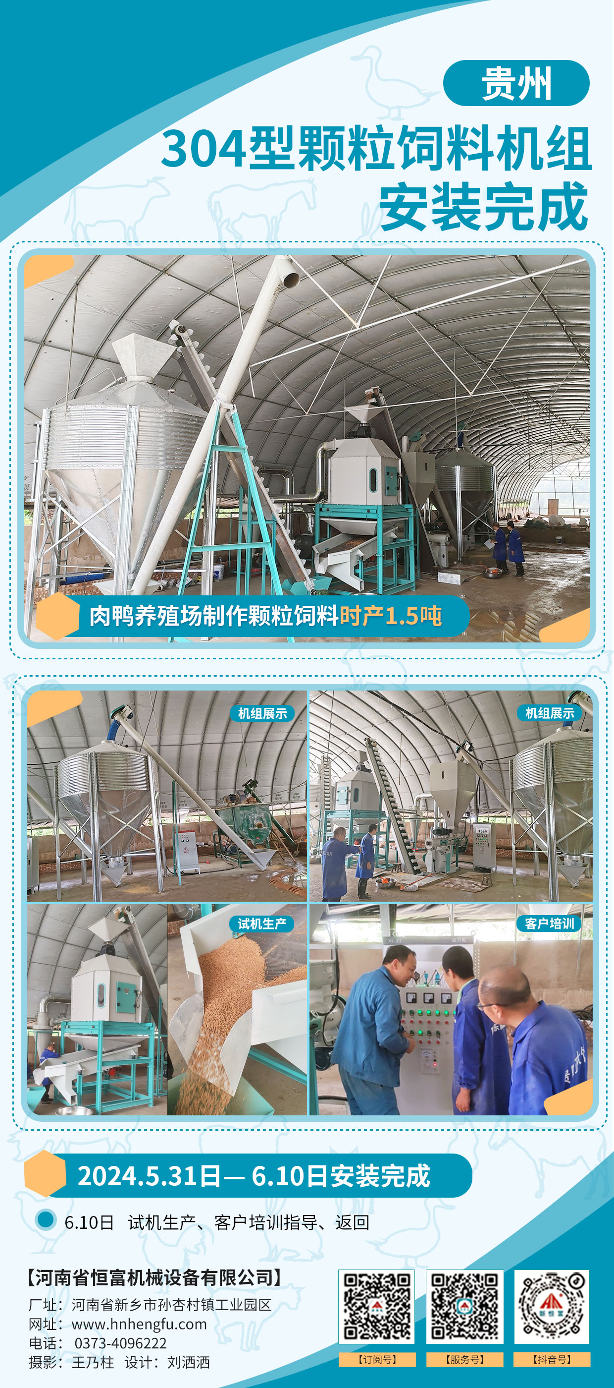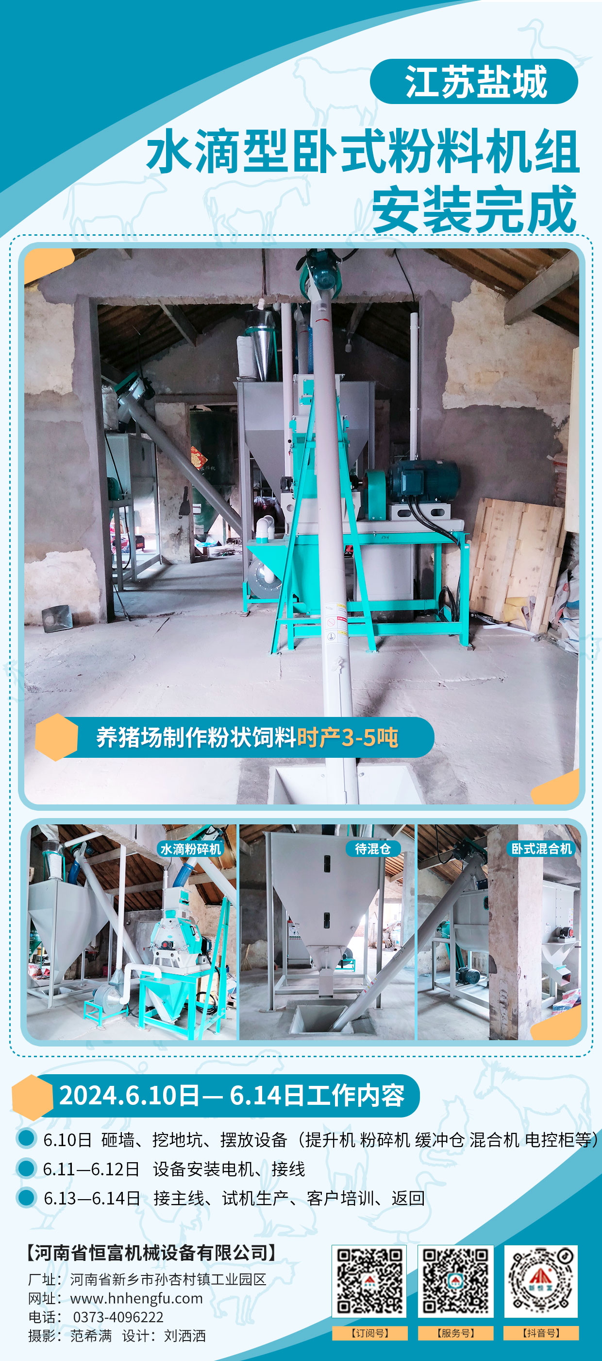 安裝完成的設備:貴州304型顆粒(lì)飼料機組、江蘇鹽(yán)城(chéng)水滴型臥式粉狀飼料機組。