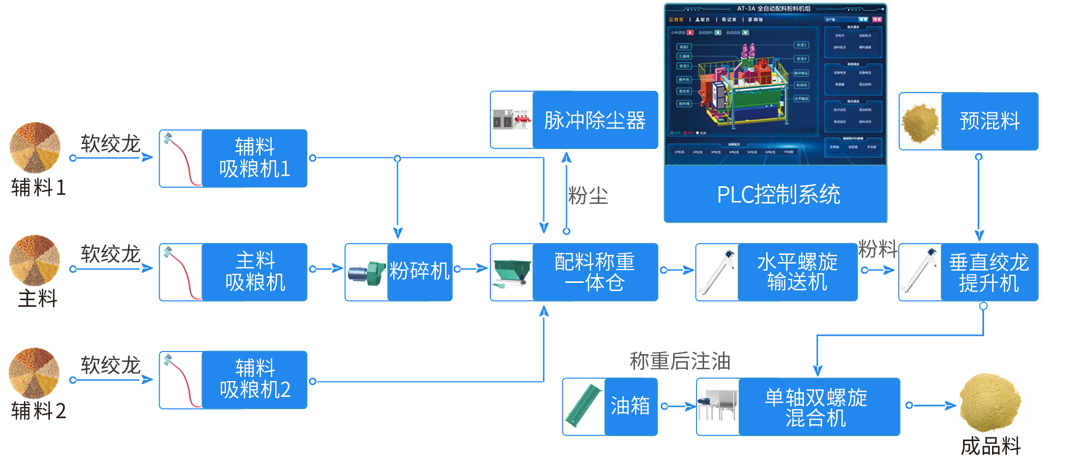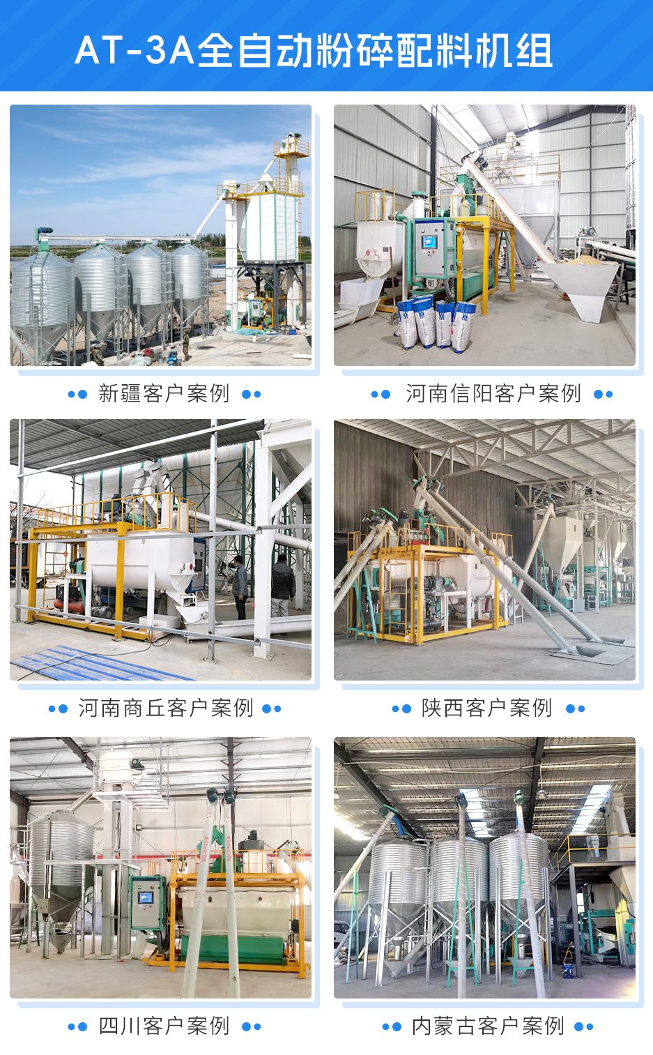 商討後決定:前端少(shǎo)量精料(liào)部分使用高效粉碎機;中間配套多(duō)個輔(fǔ)料倉,儲存預混料、石粉、麩皮;後端搭配(pèi)一套AT-3A全自動粉碎配料機組,集中(zhōng)稱重-配料-注油-混合-放料。且經改良後,機組產量可達6-8噸/時。