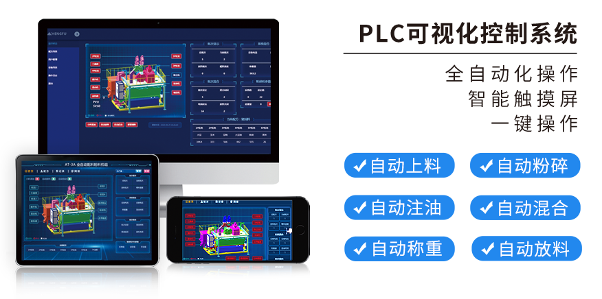 PLC可視化控製係統(tǒng),電腦 / 平板 / 手(shǒu)機全(quán)自動化智能觸摸屏一鍵操作(zuò);自動(dòng)上料、自動粉碎、自動稱重、自動注油、自動混合、自動放料。