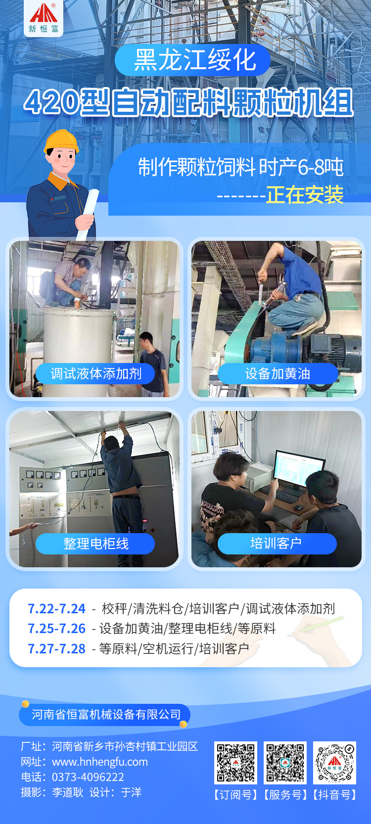 正在安裝的設備:黑(hēi)龍江綏化420自動配料顆粒飼料機組、四川雅安250型顆粒飼料機組(zǔ)。