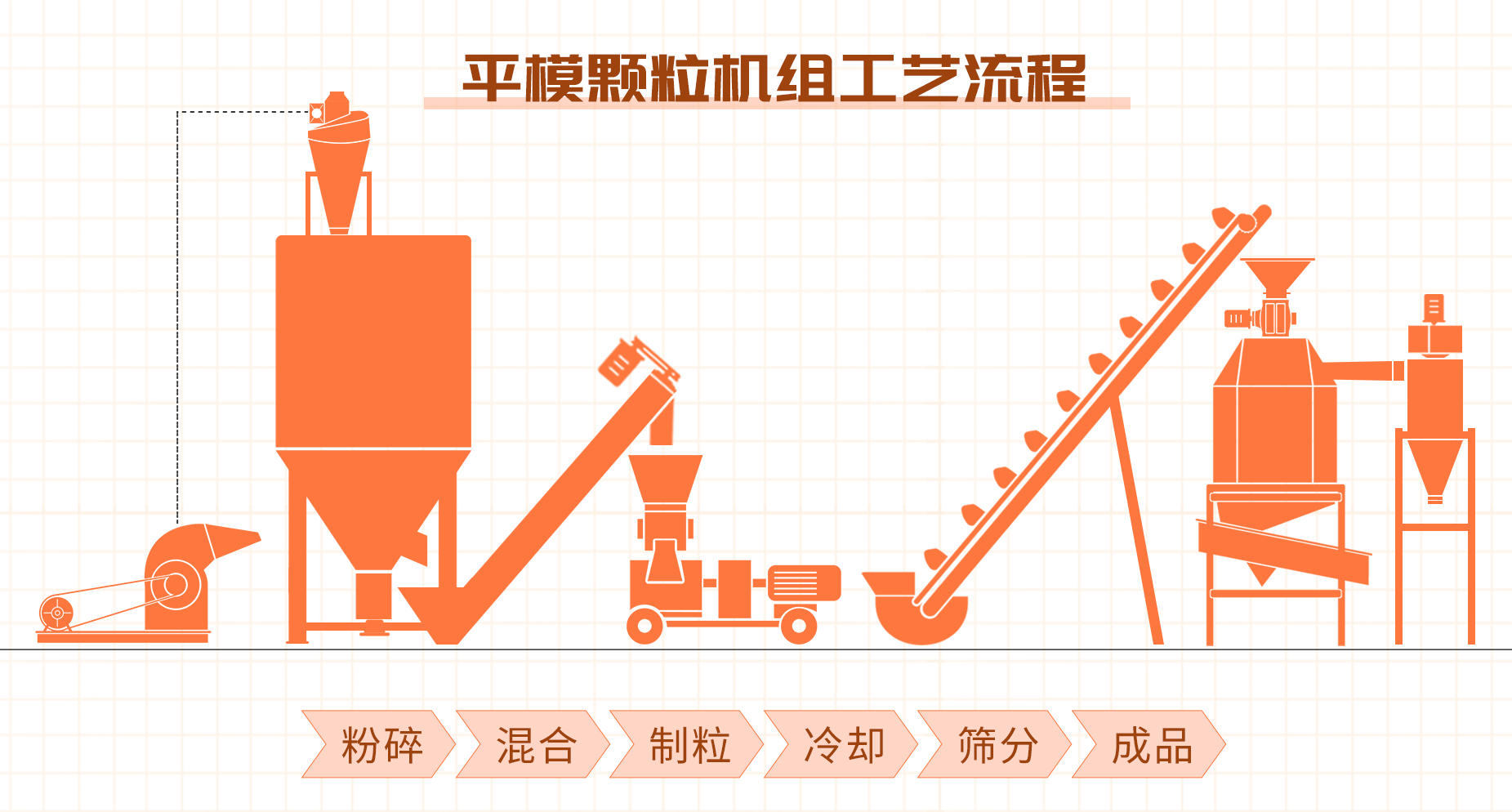 平(píng)模500顆粒飼(sì)料機組包含設備(bèi)有(yǒu):多功能粉碎(suì)機、立式混合(hé)機、平模顆粒機、翻(fān)板冷卻器、振動掛篩、螺旋提升機、挖鬥輸送機以及除塵設備、電控設備(bèi)等附屬設備。