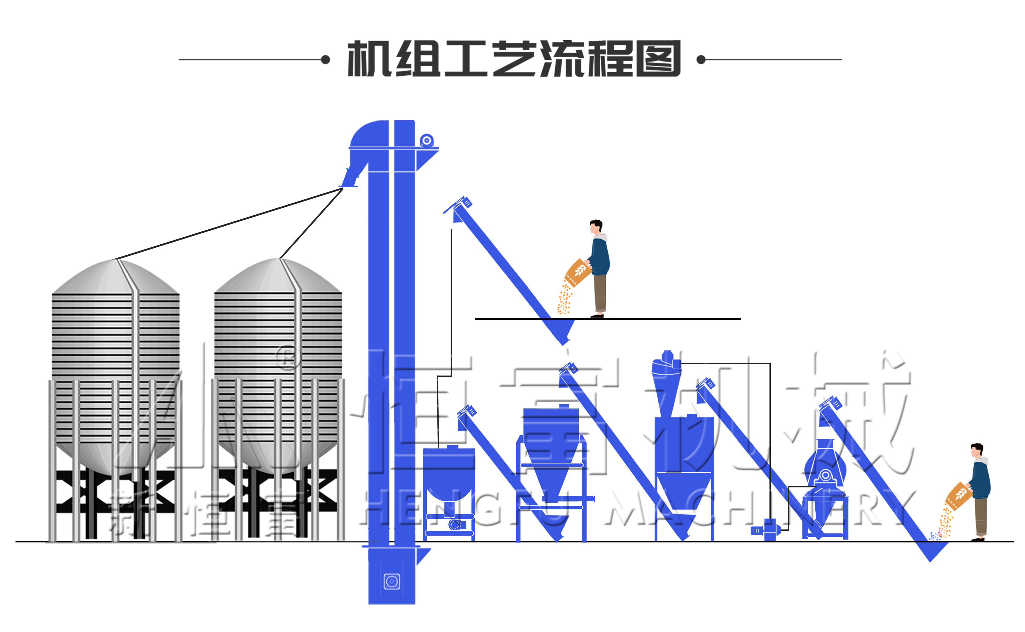 搭配的設備有水滴(dī)型粉碎機、配料秤、單軸雙螺旋混合機、提(tí)升輸送設備(bèi)、除(chú)塵除鐵設備、緩衝倉、兩個20噸成(chéng)品料塔、電控櫃、配件等。