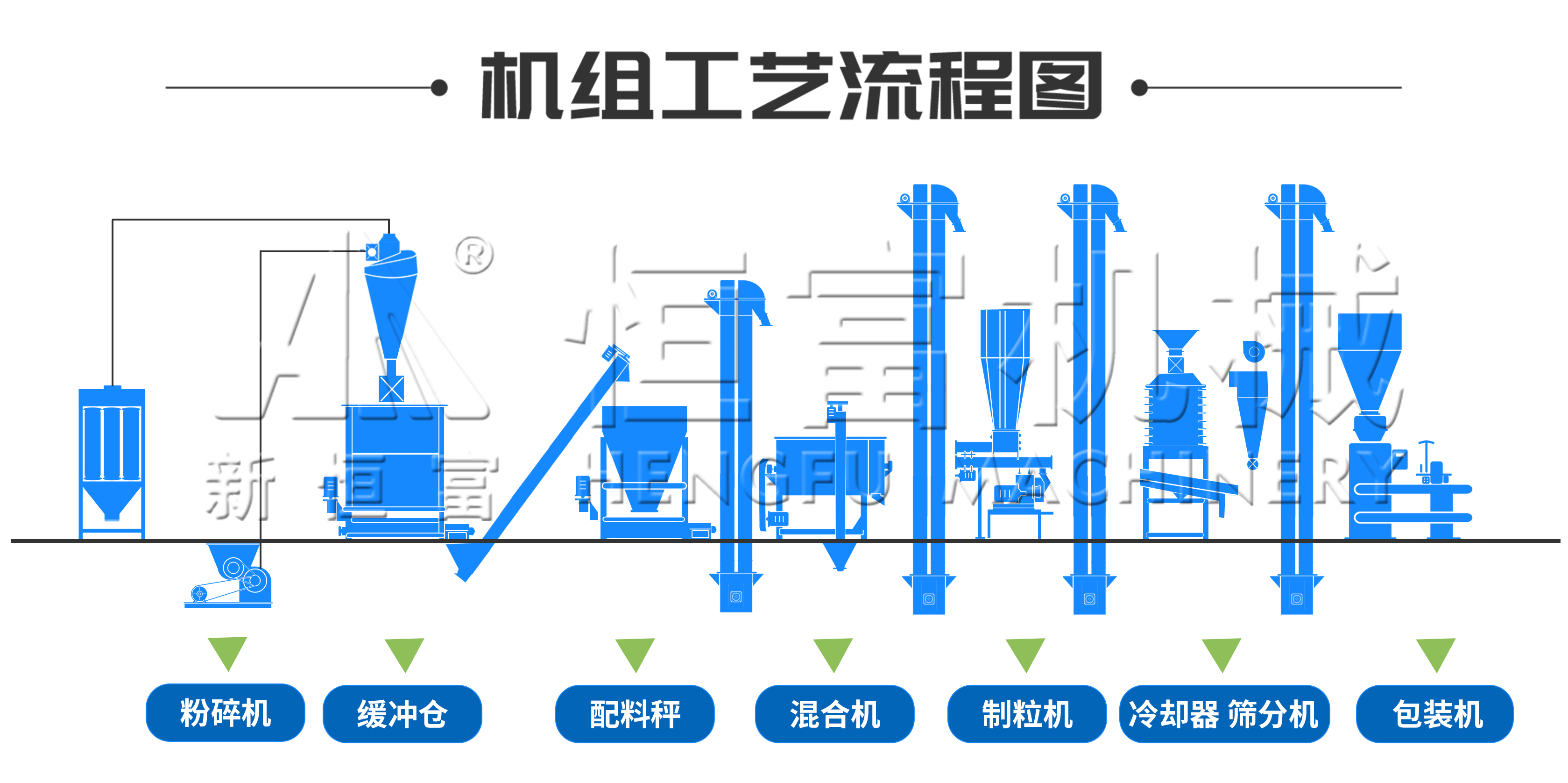 該生產線主要設備有多功能粉碎機、布袋除塵(chén)器、配料秤、單軸螺帶(dài)混合機、環模顆粒(lì)機、冷卻器及掛篩、定量包裝秤(chèng)、提升輸送設備(bèi)、電控係統等。