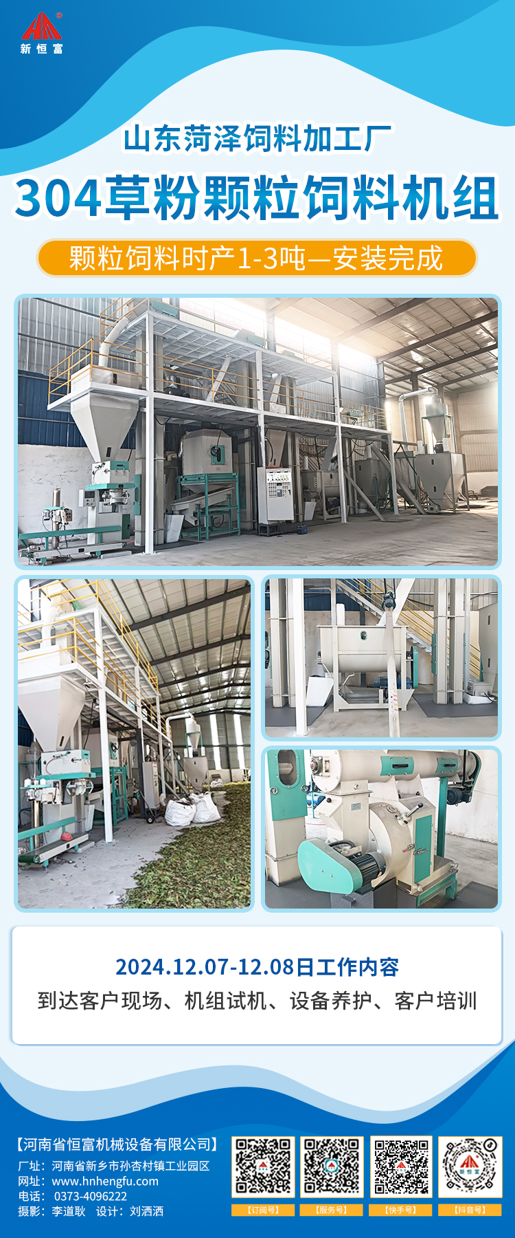 山(shān)東菏(hé)澤(zé)飼料加工廠,時產1噸草(cǎo)粉(fěn)顆粒(lì)飼料機組安(ān)裝完成。