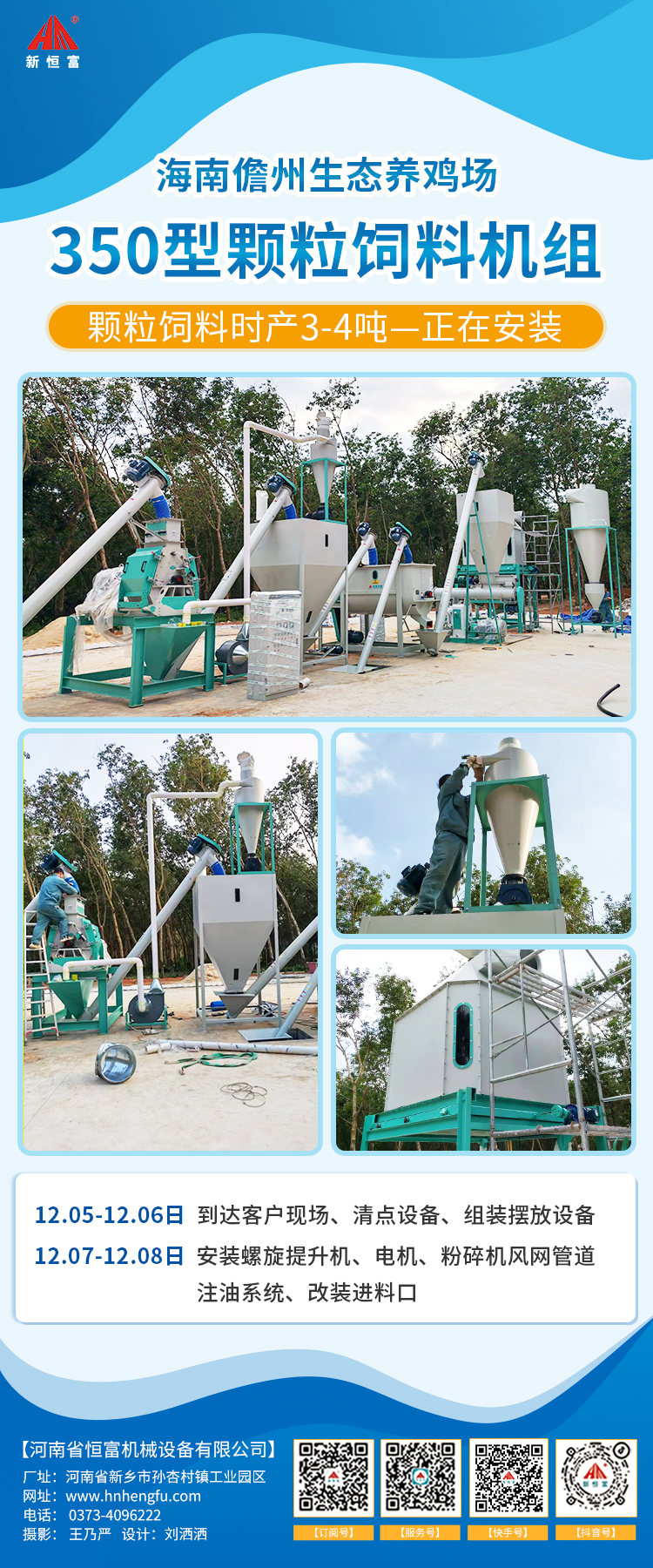海南儋州(zhōu)生態養雞場(chǎng),時產4噸顆粒飼料(liào)加工機組正在安裝。