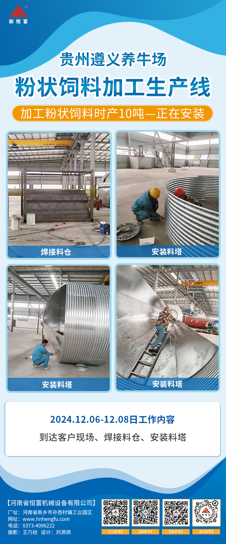 貴州遵義(yì)養牛(niú)場,時產10噸粉(fěn)狀飼料加工生產線正在安裝。