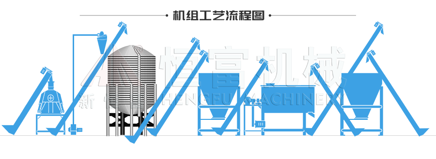 本套機組是一套製作粉狀飼料的設備(bèi),前端搭配水滴式飼料粉碎機,中間配備一(yī)個8噸料塔以及兩(liǎng)個配料秤,後端搭配了臥式單軸雙螺帶飼料混合機。在(zài)原料粉碎的同時,豆粕、麩皮、石粉(fěn)能同步進行稱重、配(pèi)料,隨後所有物料一起進行(háng)混合。本條生產線不僅可以實現原料(liào)的精準配比,還能提高生產效率(lǜ),降(jiàng)低生產成本。