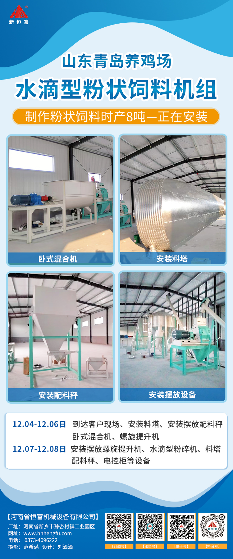 山東青島蛋雞養殖場,時產8噸粉狀飼料加工機組正在(zài)安裝。