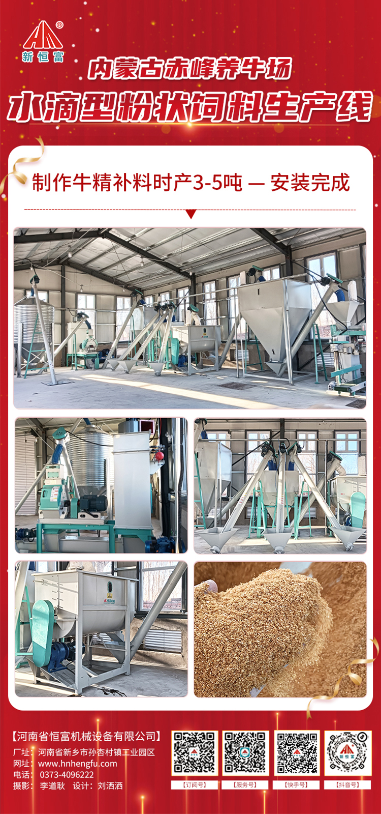 內蒙古赤峰養牛場,時產3-5噸粉(fěn)狀飼料生(shēng)產線安裝完成(chéng)。