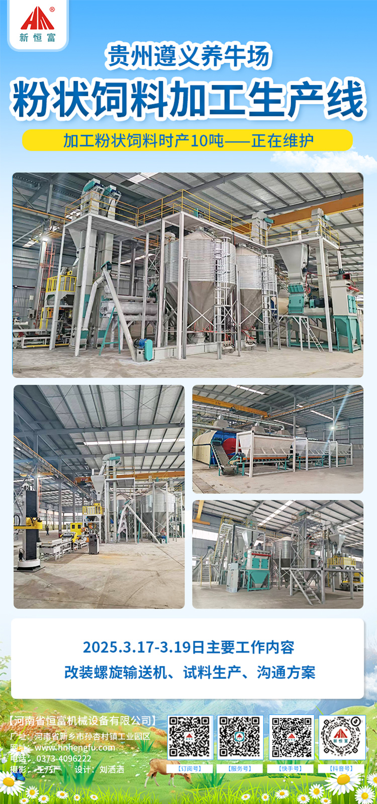 貴(guì)州遵義養(yǎng)牛(niú)場,時產10噸粉狀飼料加工生產線設(shè)備改造正在維(wéi)護。