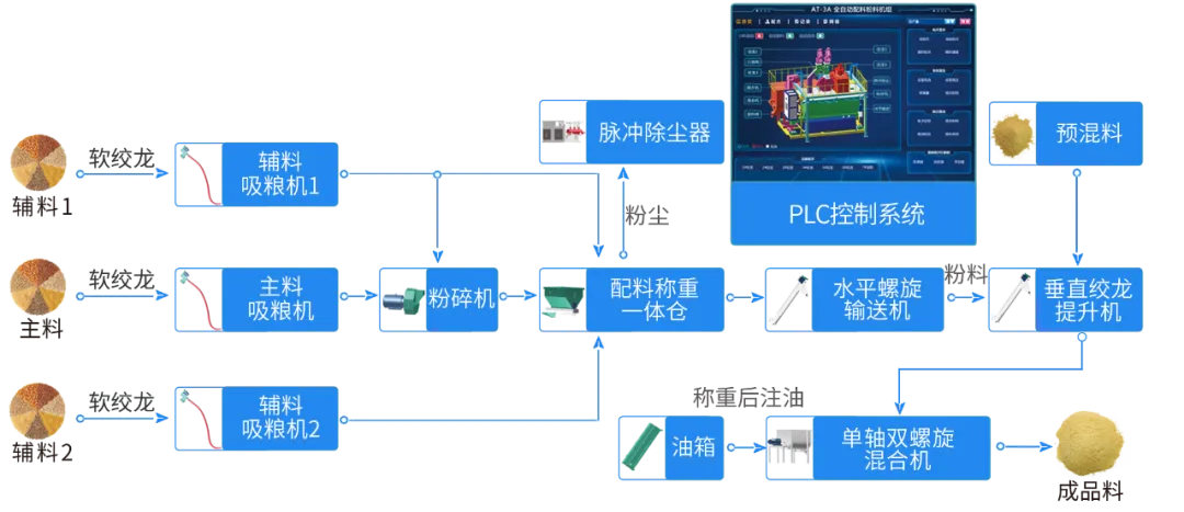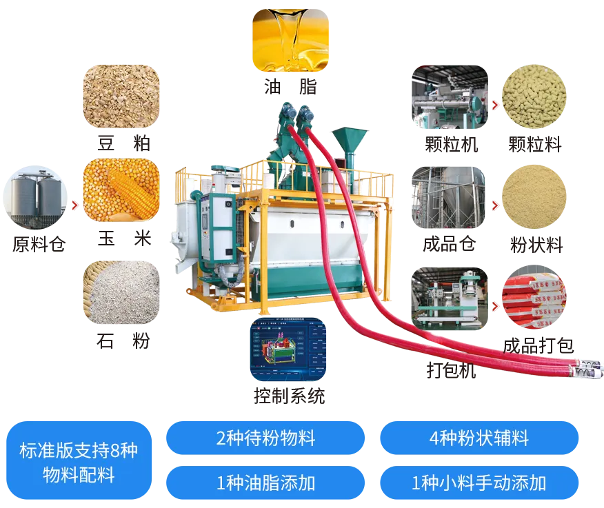 該搭配方式適(shì)用於各種規格的大、中型飼料廠和養殖場使用。配製的飼料成分均勻,無需特定(dìng)場所即可實(shí)現連續(xù)生產,同時能夠(gòu)生產預混(hún)料、混合料、濃縮料和全(quán)粉飼料等多種產品。