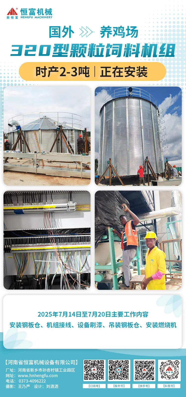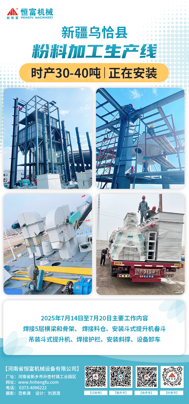 2025年7月14日至7月20日主要(yào)工作內容:裝鋼板倉(cāng)、接線(含控製(zhì)線)、刷漆、催(cuī)促客戶主線問題、固定吊裝支架(jià)、吊裝鋼板倉、焊柴(chái)油桶等。