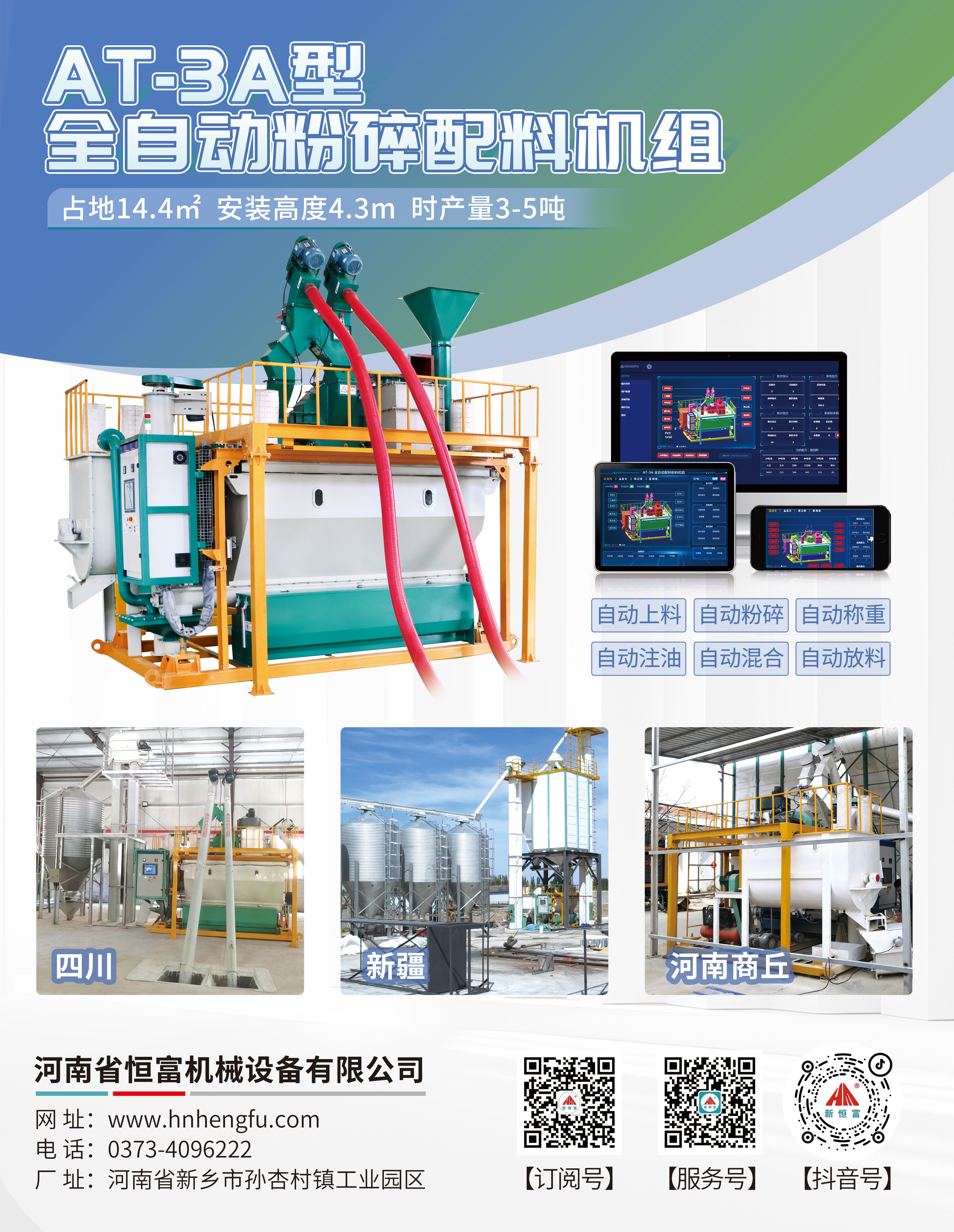 AT-3A全自動粉碎配料機組:自動上料、自動粉碎、自動稱重、自動注油、自動混合、自動放料。PLC可視化控製係統,一鍵操作,省時省力。