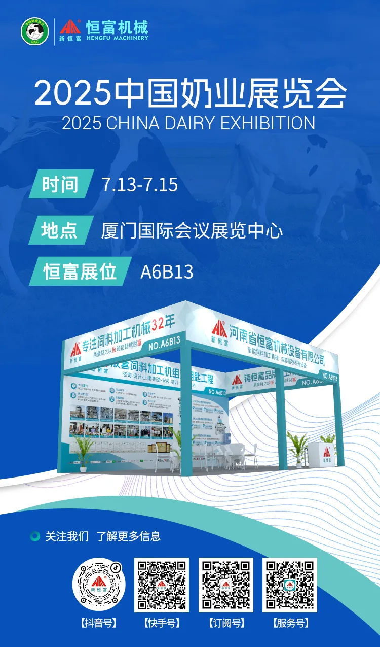 2025年中(zhōng)國奶業展覽會將於7月13日-15日在廈門國際會議(yì)展覽中心舉辦(bàn),恒(héng)富機械誠(chéng)邀您蒞臨A6B13展位,體驗(yàn)智能化飼料生產解決方案,共探行業趨勢!