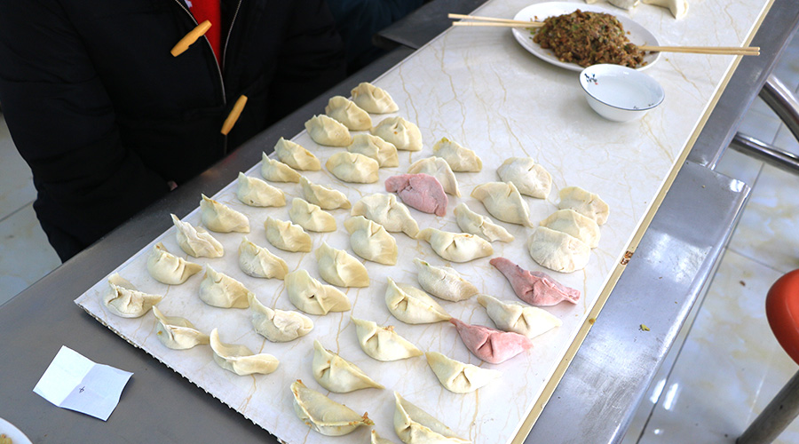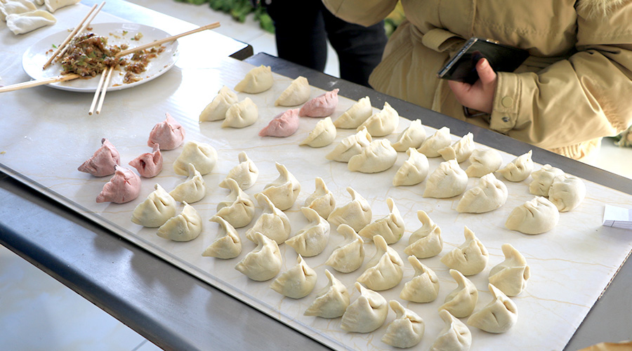 不一會兒,一排排獨具個性,形態各異的餃(jiǎo)子(zǐ)就排滿了桌子。無(wú)論包得快與慢、好與差,大家都忙在手上,樂在臉上,喜在心裏,活動現場歡笑聲不斷,氣(qì)氛火熱。